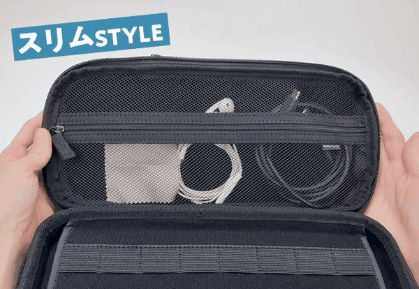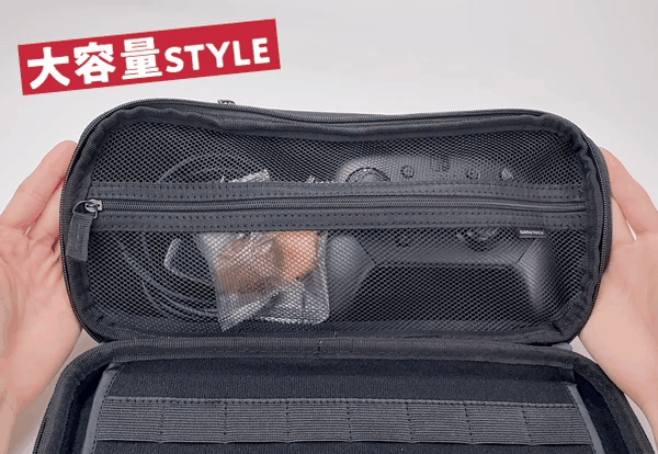 プロコン、ACアダプター、イヤホンなどの周辺機器もまとめて収納可能。拡張ファスナーを開くだけで収納力がアップし、旅行や長時間の移動でも頼れる仕様になっています!