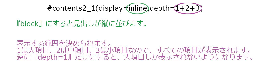 『#contents2_1(display=inline,depth=1+2+3)』だと以下のような目次になります。