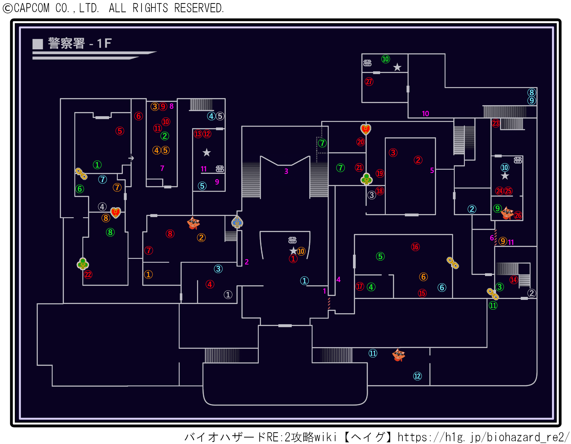 | アイテムボックス、鍵の扉、チェーンの扉はアイコンで表示してあります。タイプライターは★になります。 赤:弾薬、青:回復、緑:キーアイテム、オレンジ:武器・サイドパック、ピンク:ギミック となっています。 |