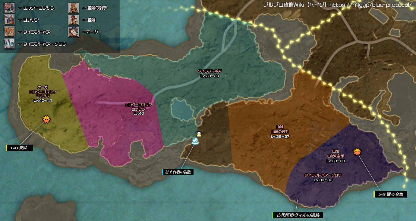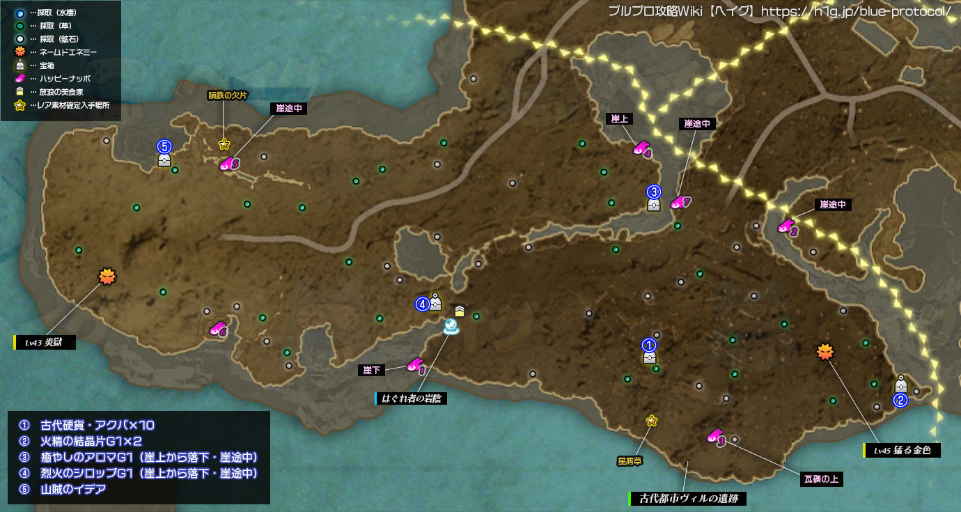 【ブルプロ】「夕凪の段丘」のマップ、宝箱、採取、転送ポータル、出現エネミー等をまとめています。