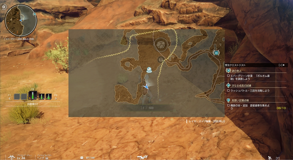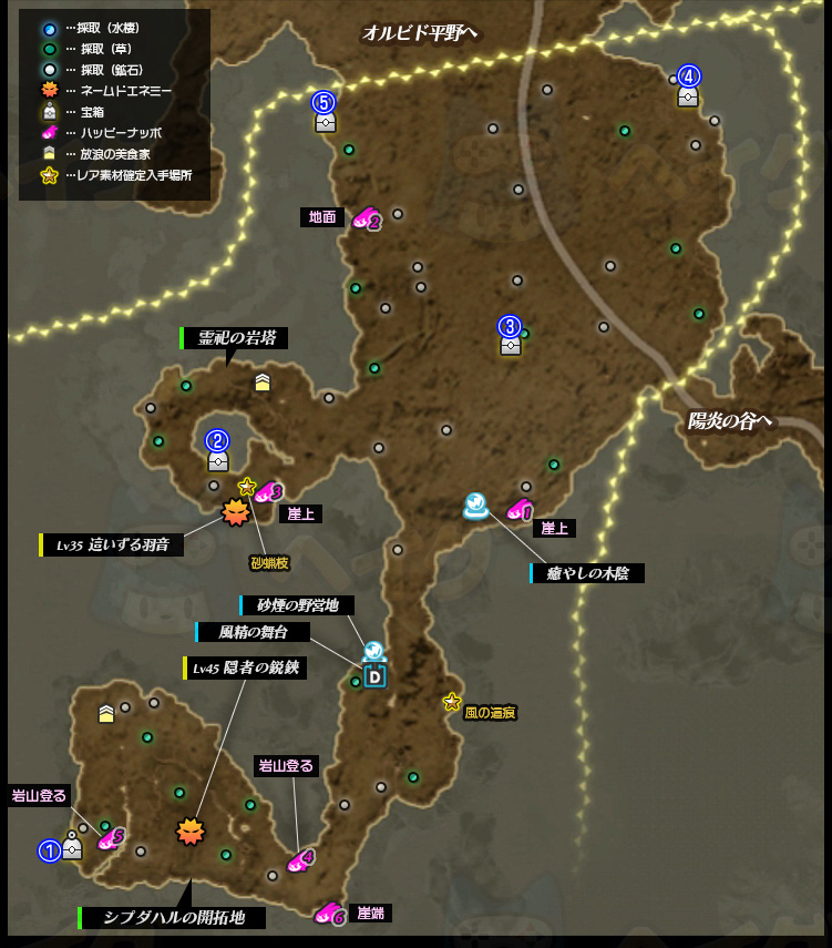 【ブルプロ】「風止みの荒地」のマップ、宝箱、採取、転送ポータル、出現エネミー等をまとめています。