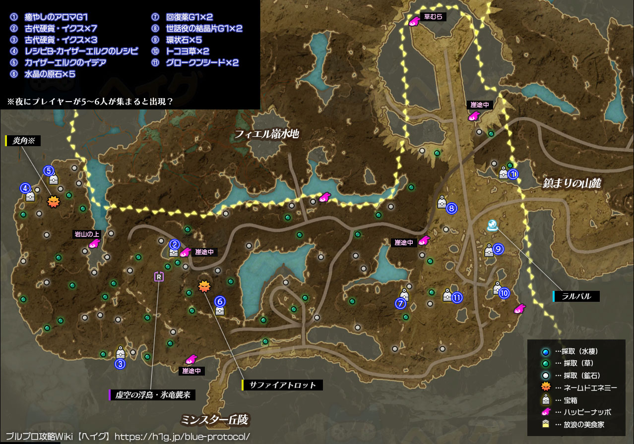 【ブルプロ】「神の見守る丘」のマップ、宝箱、踏破スポット、採取、転送ポータル、出現エネミー等をまとめています。