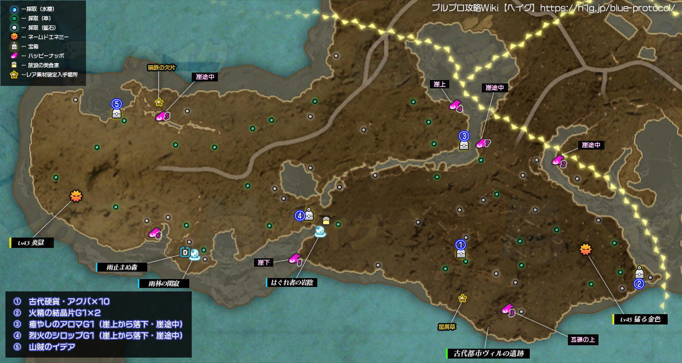 【ブルプロ】「夕凪の段丘」のマップ、宝箱、採取、出現エネミー等をまとめています。