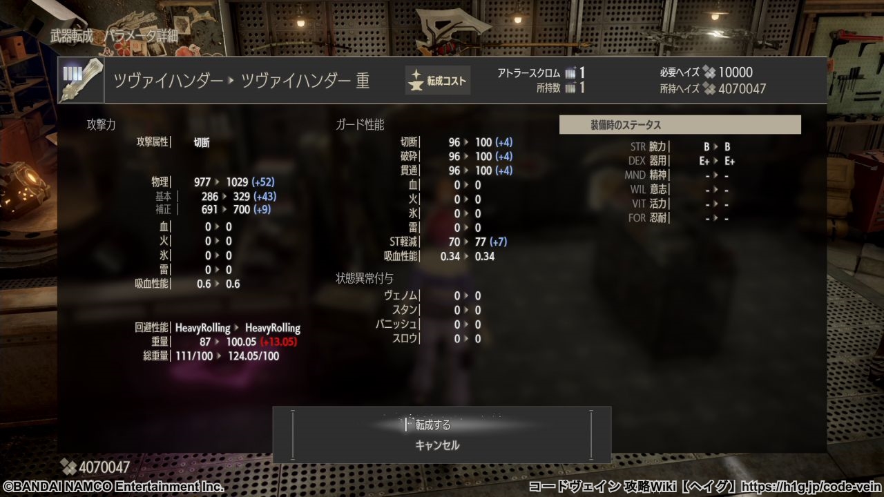 | 軽 | 重量×0.8 | 吸血攻撃力の基本×0.8 錬血能力の基本×0.95 防御力の切断・破砕・貫通×0.95 堅牢×0.9 | 重量軽減の効果の割りに、能力の下がり幅が少な目。吸血攻撃力を当てにしない吸血牙装なら、この転成を選んでも問題ない |