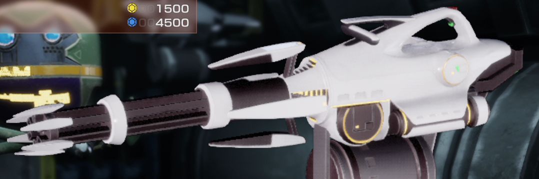 L.M.I.社が製造する、エキドナII型レーザーミニガン。 オプティクスのDタイプの完成形。 凄まじい連射速度で、4発のレーザーを同時発射する。 レーザーはトリガーを引き始めた瞬間では大きく拡散するが、連射を続けると 収束していき、最終的には遠方の敵を狙撃するに足る精度になる。 あらゆる任務に対応できる、強力な兵器だ。 |