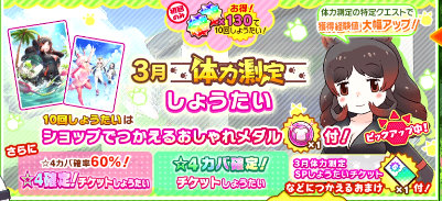 「3月体力測定SPしょうたいチケットチケット」を10枚集めると1回行えます。