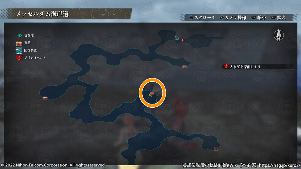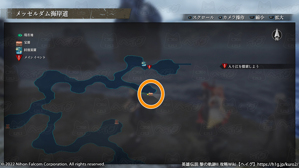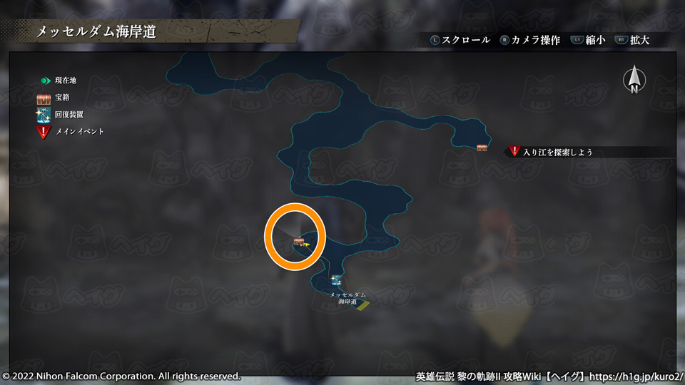 【『英雄伝説 黎の軌跡II(クロノキセキ2)』マップ「メッセルダム海岸道」で入手できる宝箱やショップ、出現する敵をまとめています。