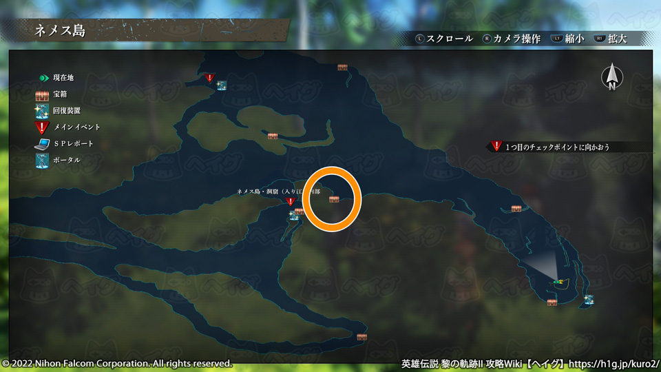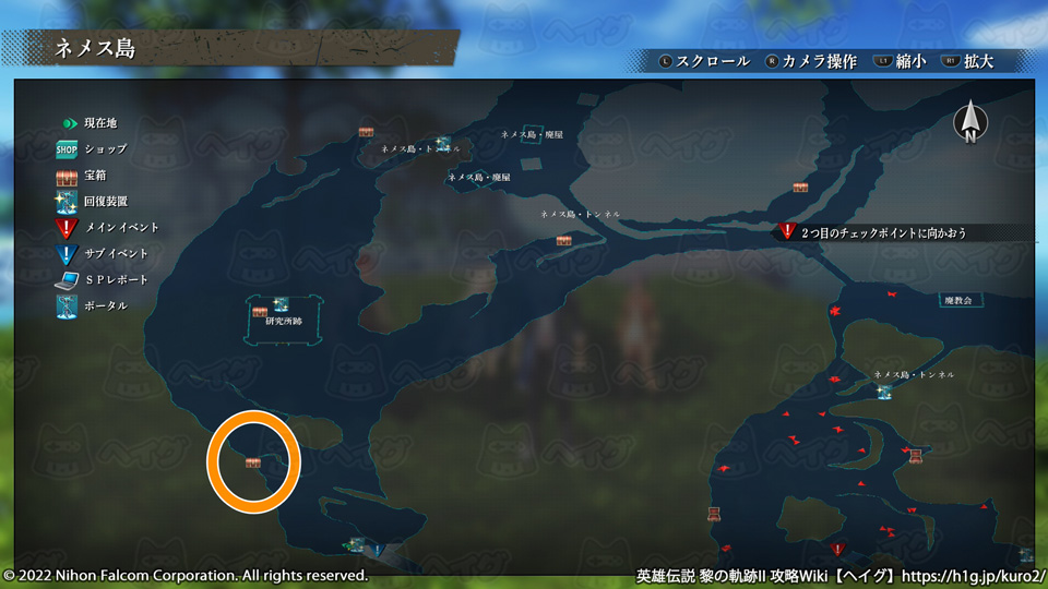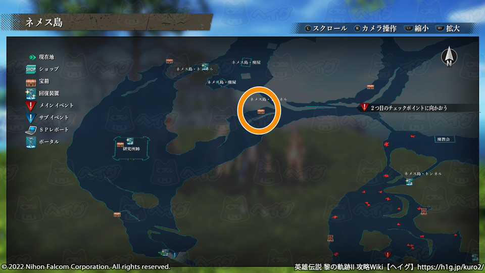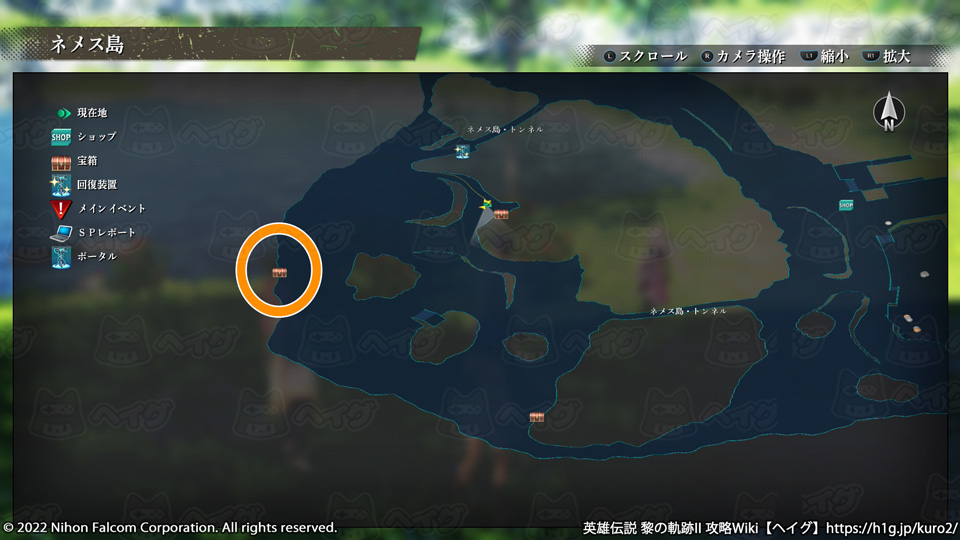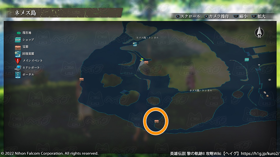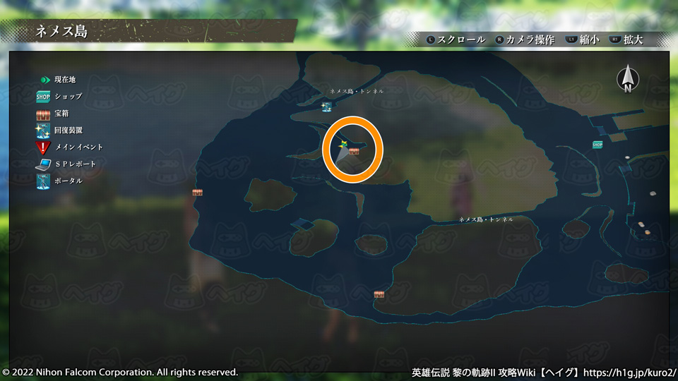 『英雄伝説 黎の軌跡II(くろのきせき2)』のマップ「ネメス島」で入手できる宝箱やショップ、出現する敵をまとめています。