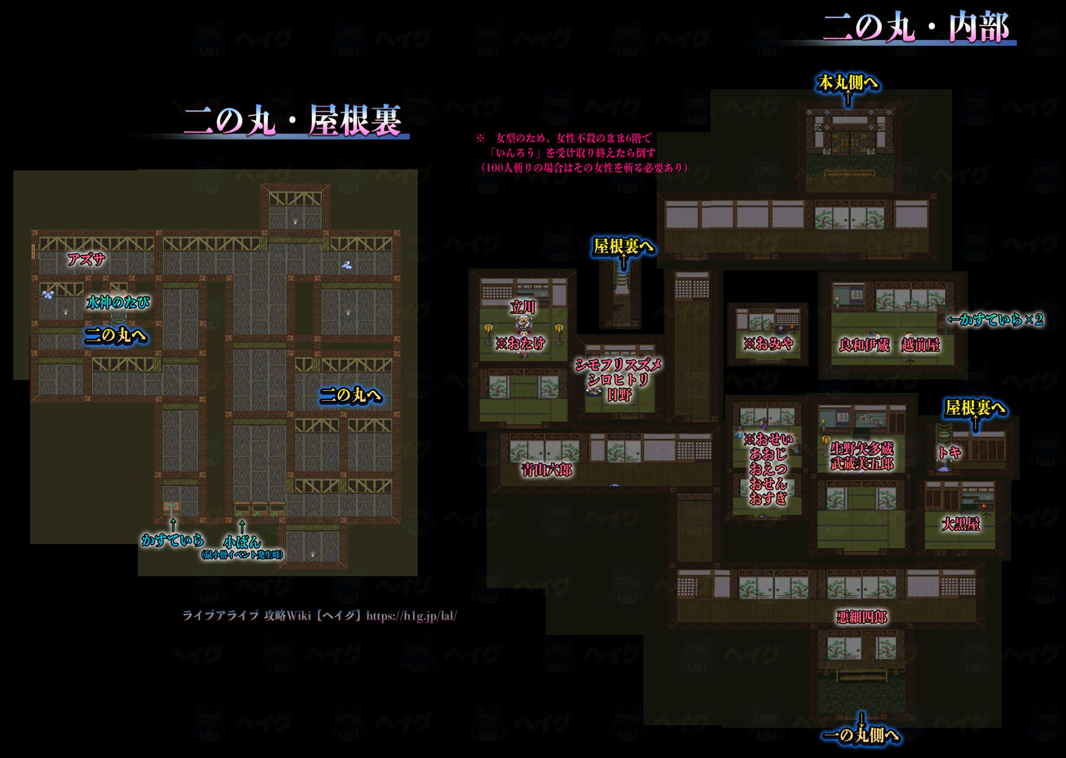 | 【マップを見ながら進んでください】 「北大十郎の部屋」→「般若丸の廊下」 (般若丸周囲の敵は般若丸が斬るので待つ。般若丸自体は襲ってこない)→「小平の部屋」へ。 ![]() | |||