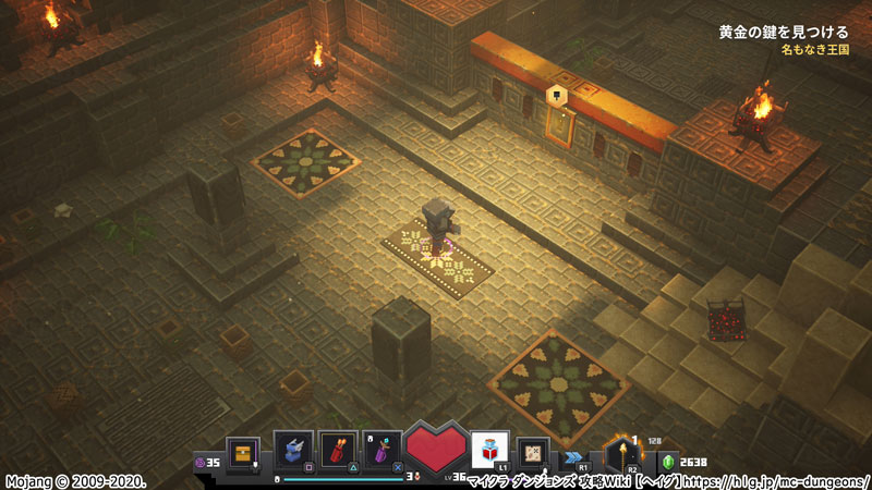 - 黄鍵で門を開けるエリア。黄鍵のある田の字型の一角に隠しレバーで開く扉がある。