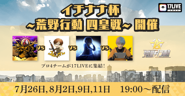 日本No.1*1ライブ配信アプリ「17LIVE(イチナナ)」を運営する株式会社17 Media Japan(東京都港区、代表取締役:小野 裕史、URL:https://17media.jp)は、人気ゲーム「荒野行動」を代表するプロチームが集い、熱い戦いを繰り広げる「イチナナ杯~荒野行動 四皇戦~」を「17LIVE」主催で7月26日(日)~8月11日(火)の期間、4回に渡りライブ配信で開催します。