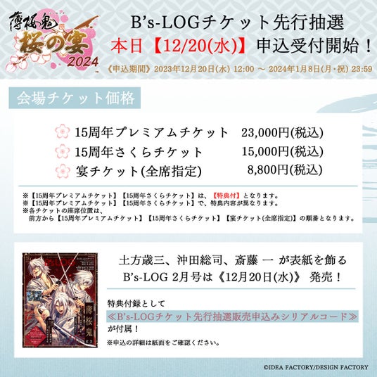 また、「B's-LOGチケット先行抽選」の申込受付を、本日12月20日(水)12時から開始いたしました。