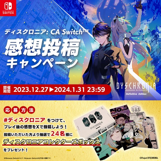 キャンペーン開催期間中、ハッシュタグ #ディスクロニア をつけて、ディスクロニア: CA Nintendo Switchをプレイした感想を投稿してくれた方より抽選で24名様に「ディスクロニアコレクターズボックス」(非売品グッズ詰め合わせ)をプレゼント!