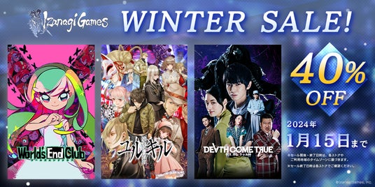 株式会社イザナギゲームズ(東京都江東区、プロデューサー兼CEO:梅田慎介)は、『Death Come True(デスカムトゥルー)』、『ワールズエンドクラブ【World's End Club】』、『冤罪執行遊戯ユルキル』の3作品のウィンターセール開催を発表いたしました。