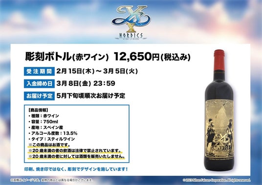また、彫刻ボトルの中身は赤ワイン。「イースシリーズ」を初めてプレイしたあの頃を思い出しながら、もしくは「イースシリーズ」がきっかけで出会ったお友達と一緒に……など、彫刻ボトルを傾けて特別な時間を過ごしてみてはいかがでしょうか?