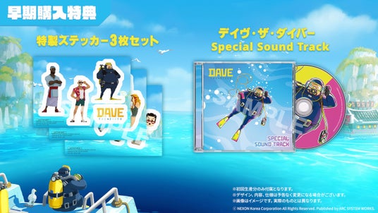 パッケージ版の特典として、ゲームのイラストや設定画像などを収めた「デイヴ・ザ・ダイバー Digital Art Book」を収録するほか、アークシステムワークスの人気対戦格闘ゲーム『GUILTY GEAR -STRIVE-』とのコラボコンテンツもお楽しみいただけます。コラボコンテンツでは、ボートペイントなどのコラボ限定アイテムがもらえるほか、バンチョ寿司には『GUILTY GEAR -STRIVE-』のコスプレ衣装に身にまとったお客様が来店します。さらに、同作のキャラクター「メイ」のテーマ曲「The Disaster of Passion」に乗せて遊べるリズムゲームもプレイ可能!?盛りだくさんのコラボコンテンツに、どうぞご期待ください!