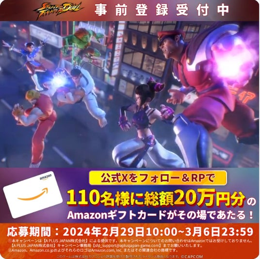 A PLUS JAPAN株式会社は、3月27日(水)配信予定のスマートフォン向けアプリ『ストリートファイター:デュエル』の事前登録を2024年2月20日(火)より開始いたしました。あわせて、事前登録者数に応じてプレゼントのアイテムが増量されるキャンペーン、Amazonギフトカードが抽選で当たるキャンペーンを開催中です。
