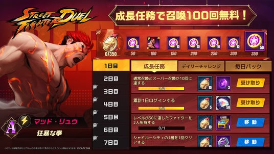 ゲームを始めてから7日間限定で、「成長任務が」登場! 毎日登場する課題を達成すると、ゲーム内で役立つアイテムが大量にもらえるほか、「マッド・リュウ」や、強力なファイターが獲得できる「召喚」に必要な「アーケードコイン」が最大100個もらえる![開催期間]