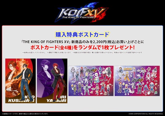 今回発売した『THE KING OF FIGHTERS XV』の新作グッズを1会計で2,200円お買い上げごとに、ポストカード(全4種)をランダムで1枚プレゼント!