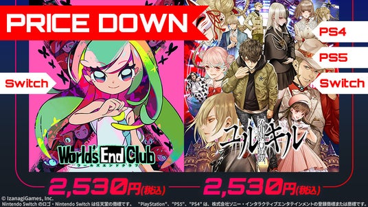 株式会社イザナギゲームズ(東京都江東区、プロデューサー兼CEO:梅田慎介)は、『ワールズエンドクラブ【World's End Club】』のNintendo Switch版と、『冤罪執行遊戯ユルキル』のNintendo Switch版、PlayStation版(PS4/PS5)のダウンロード価格を本日5月30日に値下げする価格改定を発表いたしました。