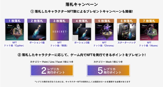 「パブリックオークション」ではNFTキャラクターの落札数に応じて報酬を受け取ることができます。『SYMBIOGENESIS』2章の重要なキャラクターのドット絵NFTやゲーム内アイテムを獲得できます。また、落札したキャラクターによって、NFTキャラクターのレプリカNFTを発行できるポイントも獲得できます。