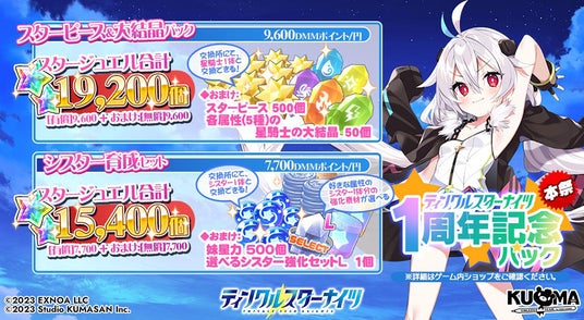 サービス開始1周年を記念し「1周年記念パック」の販売を開始します!「1周年記念パック」では、ご購入頂いたスタージュエル(有償)と同じ個数のスタージュエル(無償)を獲得することができ、更にパックに応じて「スターピース500個」や「選べるシスター強化セットL」「星騎士の大結晶」など、様々なアイテムがついてくる超お得なパックです!販売期間:7月7日(日)メンテナンス後 ~ 7月18日(木)13:59まで▼1周年記念キャンペーン