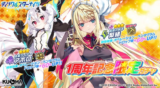 サービス開始1周年を記念し、期間限定で「★3アポロ [流星ライダー]」と「★3梨緒 [霹靂の射手]」をピックアップした限定ガチャを開催中!両キャラは1周年限定星騎士となっており、本ガチャ以外からは登場しない特別な星騎士となっていますので、ぜひ、この機会に入手してください!