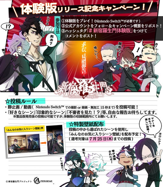 アイディアファクトリー株式会社(代表取締役社長:佐藤 嘉晃/所在地:東京都豊島区)は男性キャラクターの“友情”“絆”に重きをおいた作品を中心に展開するゲームブランド「ALTERGEAR(オルタギア)」からリリースされる、Nintendo Switch(TM)用ゲームソフト「新宿羅生門 ―Rashomon of Shinjuku―」の体験版配信開始を発表しました。