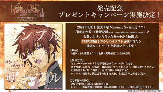 アイディアファクトリー株式会社(代表取締役社長:佐藤 嘉晃/所在地:東京都豊島区)の女性向けゲームブランド「オトメイト」は、Nintendo Switch(TM)用ゲームソフト『緋色の欠片 玉依姫奇譚 ~おもいいろの記憶~ for Nintendo Switch』の発売を記念した、プレゼントキャンペーンの実施を決定いたしました。キャンペーンでは、本作をお買い上げいただいた方の中から抽選で、描きおろし複製イラスト色紙(鬼崎拓磨)をプレゼントいたします!