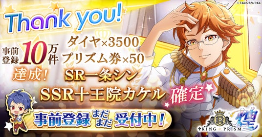 事前登録キャンペーンが、10万件を達成しました。これに伴い、SR「一条シン」・SSR「十王院カケル」を含む豪華報酬を、ゲームリリース時全員にプレゼントいたします。