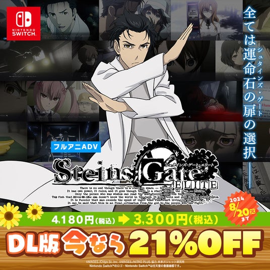 MAGES.作品からは、代表作「STEINS;GATE」シリーズより、全編をアニメーション映像でプレイできるフルアニADV『STEINS;GATE ELITE』 、「STEINS;GATE」から派生した3作品が収録された『STEINS;GATE ダイバージェンシズ アソート』がラインナップ。 そして、夏にぴったりなホラーADV「コープスパーティー」シリーズより、『コープスパーティー ブラッドカバー リピーティッドフィアー』、『コープスパーティー BLOOD DRIVE』の2作品が50%オフに。