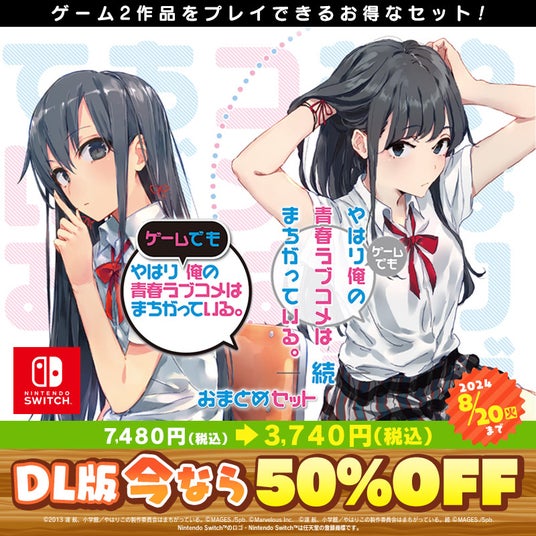 また、アニメ関連タイトルからは、 TVアニメ「俺ガイル」のコンシューマゲーム第3弾『やはりゲームでも俺の青春ラブコメはまちがっている。完』や、新作アニメの劇場上映が発表され話題の「五等分の花嫁」のコンシューマゲーム第2弾『映画「五等分の花嫁」 ~君と過ごした五つの思い出~』などが対象となっております!この機会をお見逃しなく!