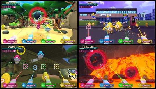 Joy-ConTMを銃に見立てて、片手持ちで画面内の敵を狙って撃つだけの簡単操作!弾数制限も無く、バンバン撃ててノーストレス!しかも、フィールド移動はフルオートなので、攻撃に集中できます!また、ステージに登場する敵や設置物を撃ち倒すと手に入るコインの獲得数が得点となる明快なルールなので、小さなお子様でも安心してお遊び頂けます!