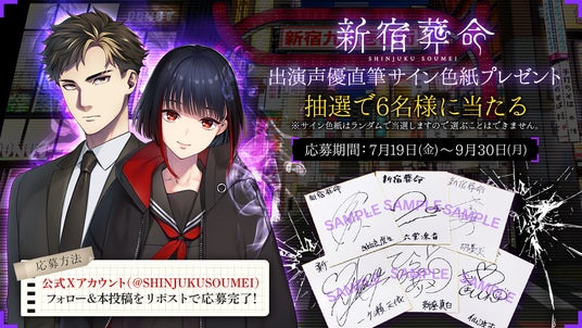 株式会社ジー・モード(本社:東京都品川区、代表取締役社長:加藤征一郎 https://gmodecorp.com/)は、人気クリエイター「片岡とも」「すめらぎ琥珀」が贈るアドベンチャーゲーム「新宿葬命」Nintendo Switch版の予約開始を記念して、抽選で6名様に出演声優直筆サイン色紙が当たるプレゼントキャンペーンを実施したことをお知らせいたします。
