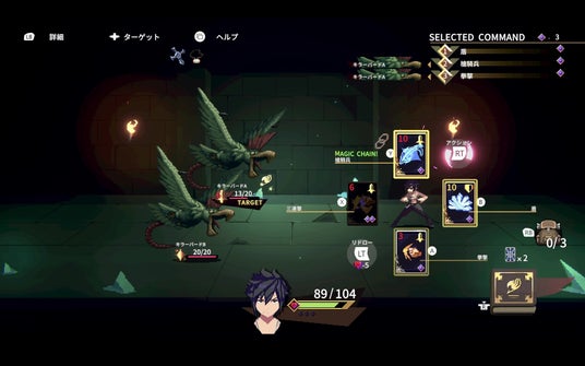 戦闘パートでは手持ちのカードデッキから、攻撃・防御・魔法などを選択し敵と戦います。カードの組み合わせによって、特定の順番で使用すると発動する「マジックチェイン」で大ダメージを狙うことができます。