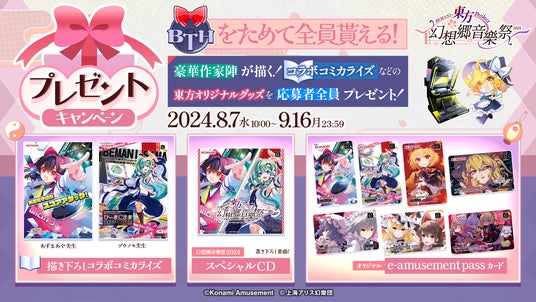 本イベントでは、「BEMANI」をはじめとした様々な対象機種にて人気の東方アレンジサークルと「BEMANI Sound Team」による書き下ろし東方アレンジ楽曲や、「東方Project」に関連するカスタマイズアイテムなどが登場します。楽曲は一定の条件をクリアすると一部「BEMANI」機種と『ポラリスコード』でプレーできるようになります。合わせて、対象の機種をプレーしたり「e-amusement購買部」で対象アイテムを購入したりすることで獲得できる「BTH(ビーティーエイチ)」を貯めて応募するとスペシャルグッズがもらえる「幻想郷音樂祭2024プレゼントキャンペーン」を開催します。