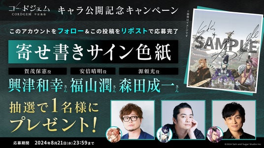 X(旧Twitter)キャンペーン実施中!キーキャラクターと新PVの公開を記念して、福山潤さん、森田成一さん、興津和幸さん 寄せ書きサイン色紙を抽選で1名様にプレゼントいたします。