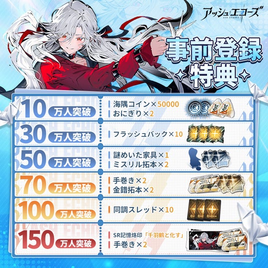 本日より多元世界RPG『アッシュエコーズ』の事前登録が開始されました。App StoreおよびGoogle Playでの事前登録が可能です。また、事前登録で目標人数を達成するとゲーム内アイテムやキャラクターがもらえるキャンペーンも実施いたします。ぜひご友人をお誘い合わせの上、登録してお待ちください。