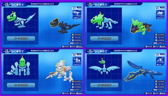 ゲーム序盤では、すべての条件を達成するのは困難ですが、何度もステージ攻略にチャレンジすることで、強力なパーツを手に入れたり、より強いほねほねザウルスが作れるキットを手に入れることができ、難しいステージの制覇ができるようになります。