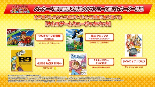 また、パッケージ版の早期購入特典、ダウンロード版プレオーダー特典として、ナムコ名作タイトルの楽曲5曲が遊べる「ナムコゲームミュージックパック」が付属します!是非、予約してゲットしてください!