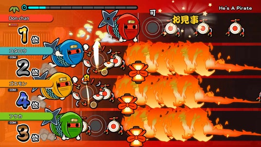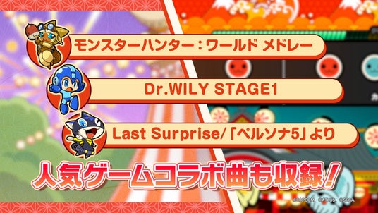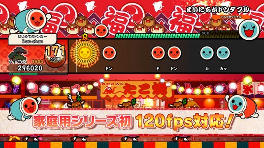 家庭用シリーズ初となる120fps対応、新プラットフォーム専用のコラボ楽曲やぷちキャラを収録し、さらにNintendo Switch(TM)版にてアップデートで追加した「走れ!ニンジャ道場」も本編に収録して登場します。太鼓ミュージックパスや個別販売曲も、Nintendo Switch(TM)版で配信中の楽曲を発売日よりプレイいただけます。