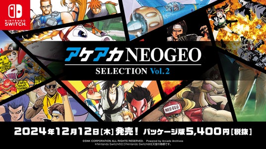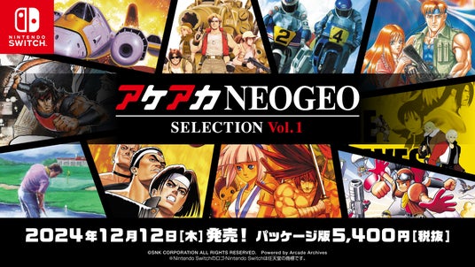 株式会社SNK (本社:大阪府大阪市、代表取締役社長:松原 健二)は、「NEOGEO」の名作・傑作ゲームを10タイトル収録したコレクション作品『アケアカNEOGEO セレクション Vol.1』、『アケアカNEOGEO セレクション Vol.2』を、Nintendo Switch(TM)のパッケージ版として、2024年12月12日(木)に2本同時発売することをお知らせいたします。