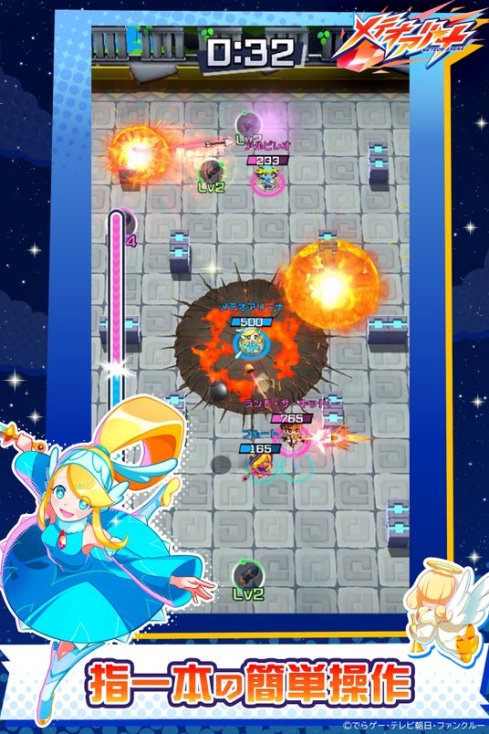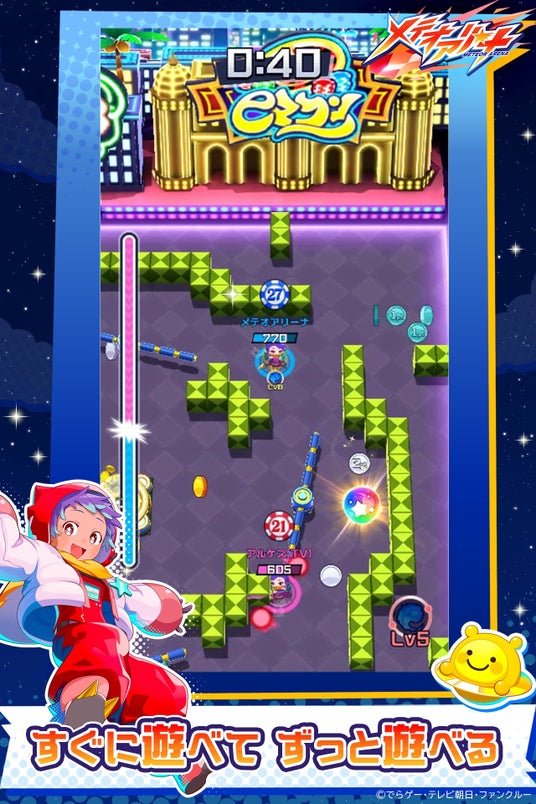 チーム対抗のアクションゲームで、チームの仲間とともに勝利を目指します。操作は移動のみという直感的でシンプルな操作方法ながらも、熱い駆け引きが楽しめるのがこのゲームの特長です。勝負の鍵を握るのは、一発逆転を可能にする「メテオ」攻撃。空高く飛び上がって盤面に打ち込む超強力な攻撃は戦況を大きく動かします。パーティー感のあるポップな世界観と、バラエティ豊かなキャラクターたちも注目ポイントです。