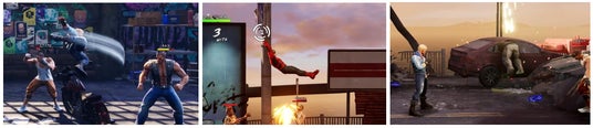 近くに武器になりそうなものがあった場合拾って使用したり、そのまま蹴り飛ばして敵にぶつけたりと様々なアクションに派生する。