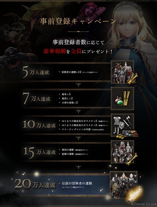 事前登録期間中の登録数に応じて、仲間や装備、特別なアイテムなど、ゲーム内で使用できる豪華報酬を全員にプレゼントするキャンペーンを実施中です。
