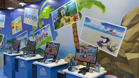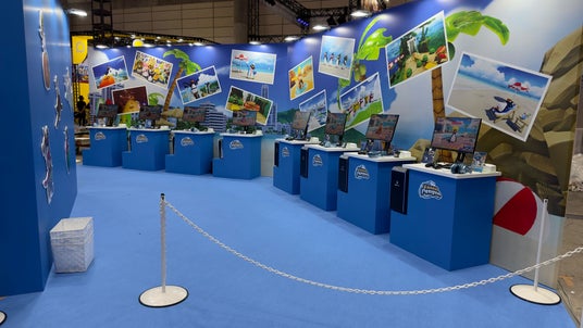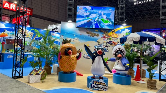 ブースはバケーションを満喫するペンギンたちが目印、ゲームに登場するペンギンたちが巨大なフィギュアとなってお出迎え中、写真撮影も可能となっております!