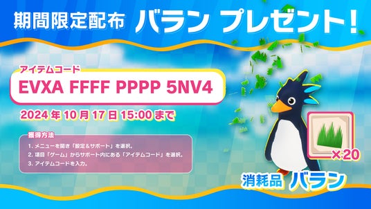 消耗品アイテム”バラン”を20個プレゼント! イベント期間中に挑戦できるチャレンジや期間限定ショップで寿司スキンをゲットしてバランをバラまきましょう!こちらも期間中にコードを入力することで獲得可能ですので、ぜひゲットしてスキンを使ってみてください!