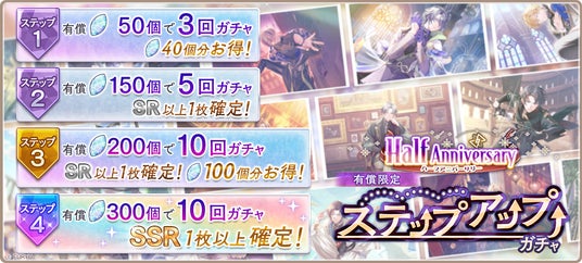 『廻らぬ星のステラリウム』で初となる、「有償限定ステップアップガチャ」が登場。最大STEP4までご用意し、ガチャを回すごとに異なるボーナスが発生します。STEP4では、SSRカード1枚以上が確定でゲットできる特別なガチャです。