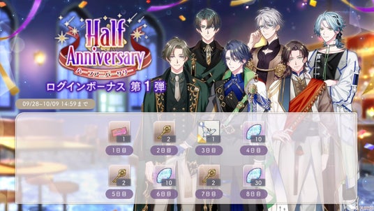 本日9月28日(土)~10月31日(木)までの期間、豪華アイテムをゲットできるログインボーナスを開催します。第1弾~第3弾までご用意し、「Half Anniversary無料10連ガチャ」を引くことができる「10連ガチャチケット(0.5th)」や、本キャンペーン限定の「記念レシピ」、ゲーム内で使用できるクォーツ最大150個などを獲得することが可能です。
