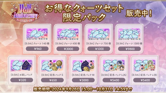 キャンペーン期間中、ゲーム内で使用できるクォーツをお得に購入できるセットや豪華なアイテムがつまった記念パックが登場します。